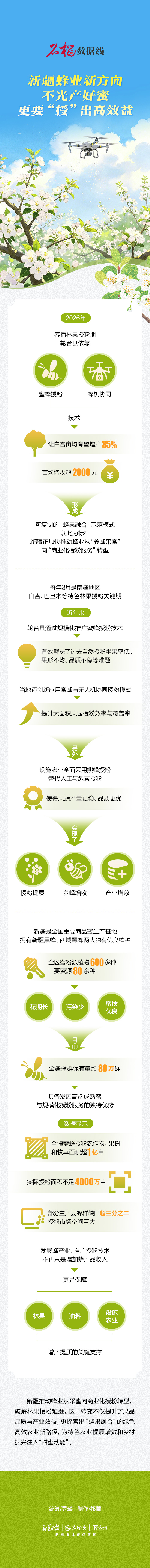 2026年春播林果授粉期,轮台县依靠蜜蜂授粉、蜂机协同技术,让白杏亩均有望增产35%,亩均增收超2000元,形成可复制的“蜂果融合”示范模式。