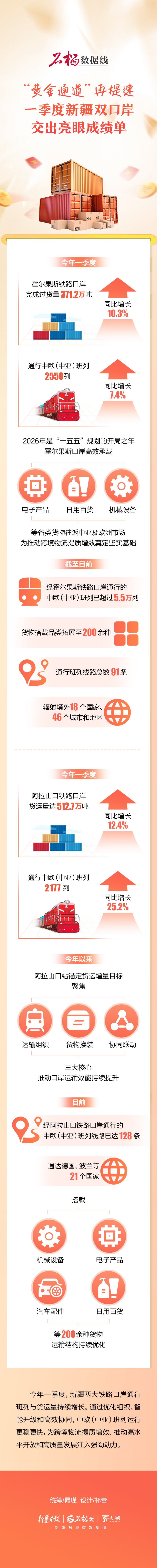 今年一季度,新疆两大铁路口岸通行班列与货运量持续增长。通过优化组织、智能升级和高效协同,中欧(中亚)班列运行更稳更快,为跨境物流提质增效、推动高水平开放和高质量发展注入强劲动力。