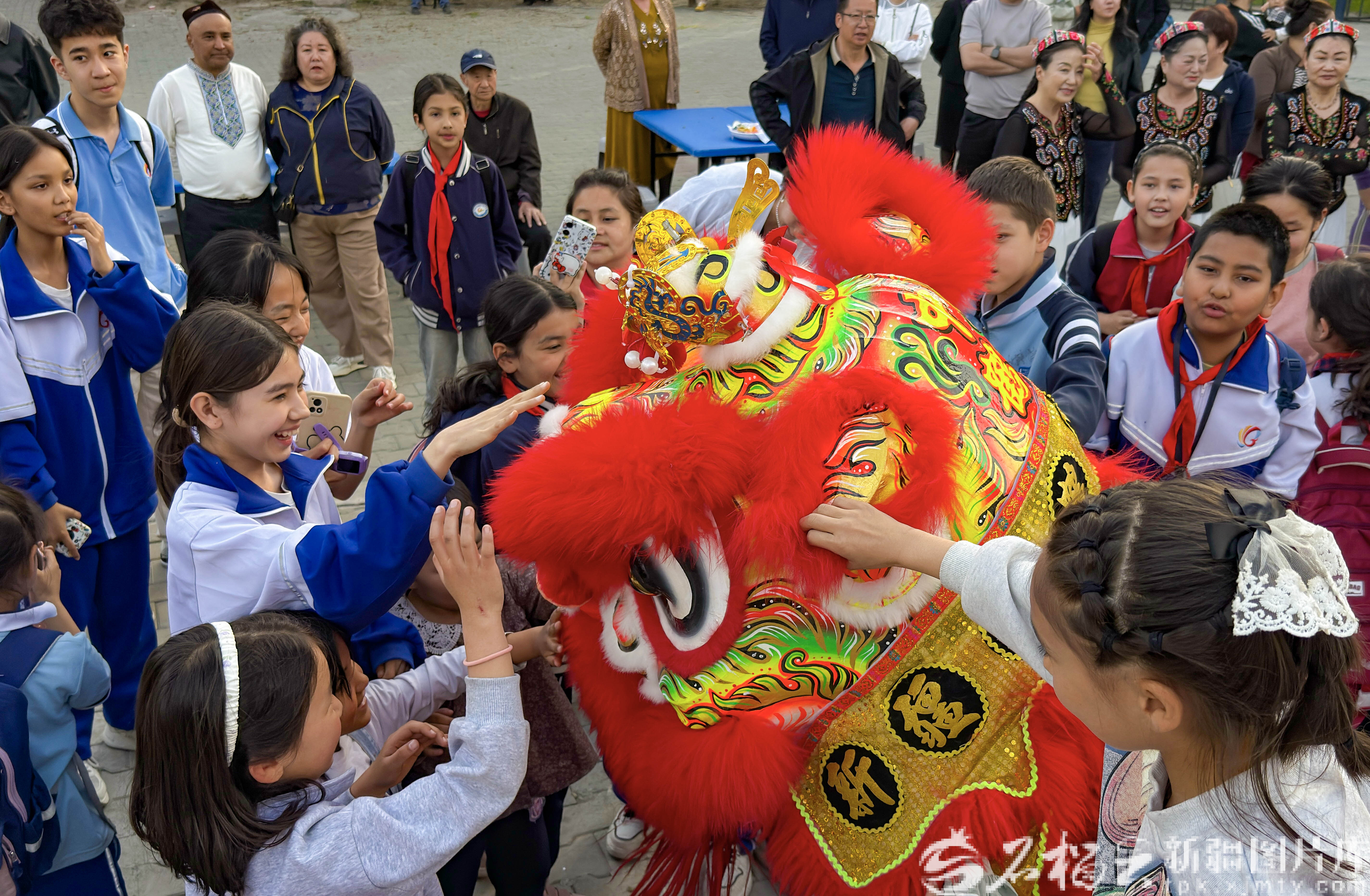 4月16日,演出现场,学生和舞狮演员互动。