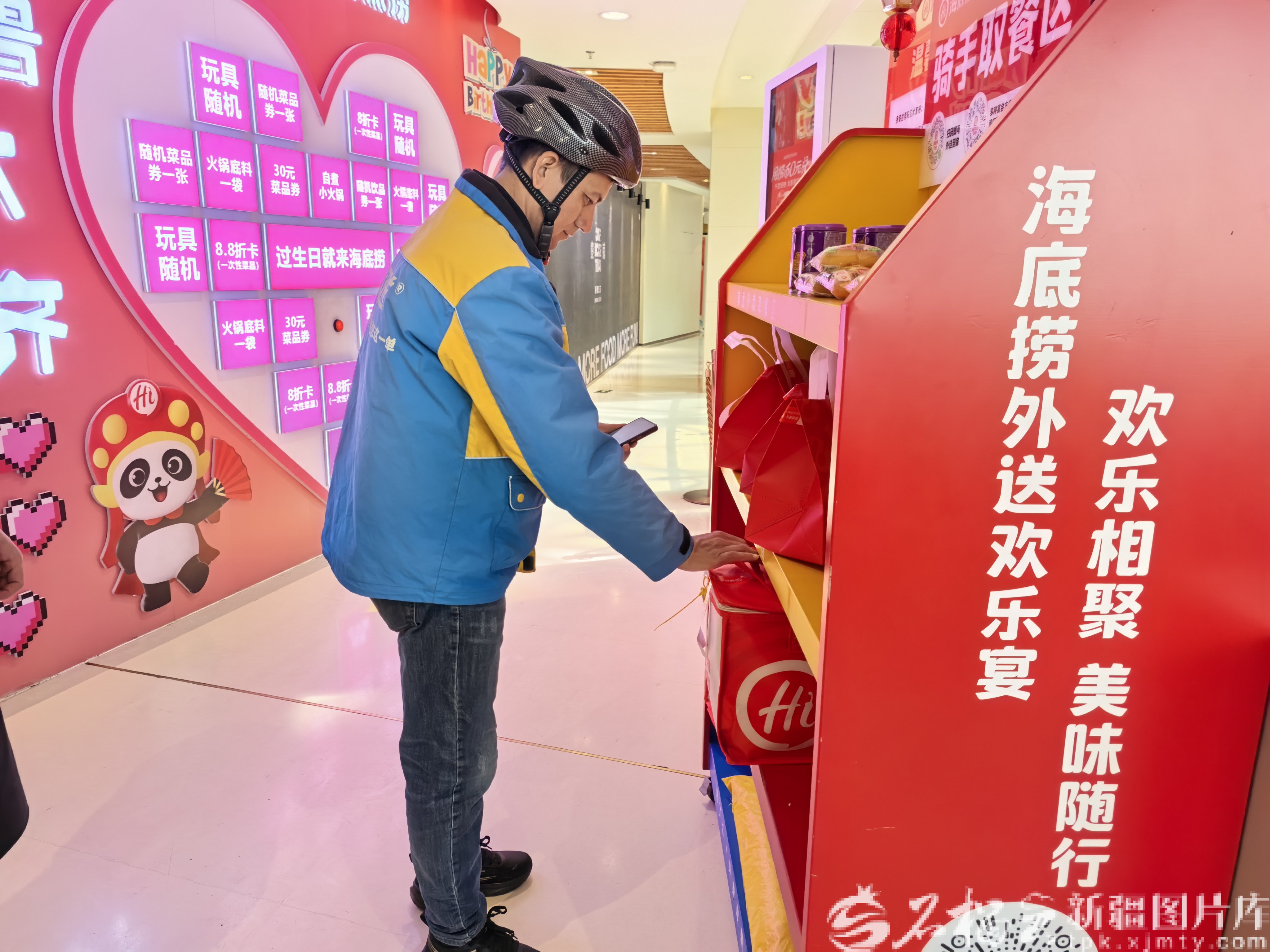 4月14日,乌鲁木齐市CCMALL时代广场一位外卖骑手取餐时核查“食安封签”。天山网-新疆日报记者 索蓉芝摄