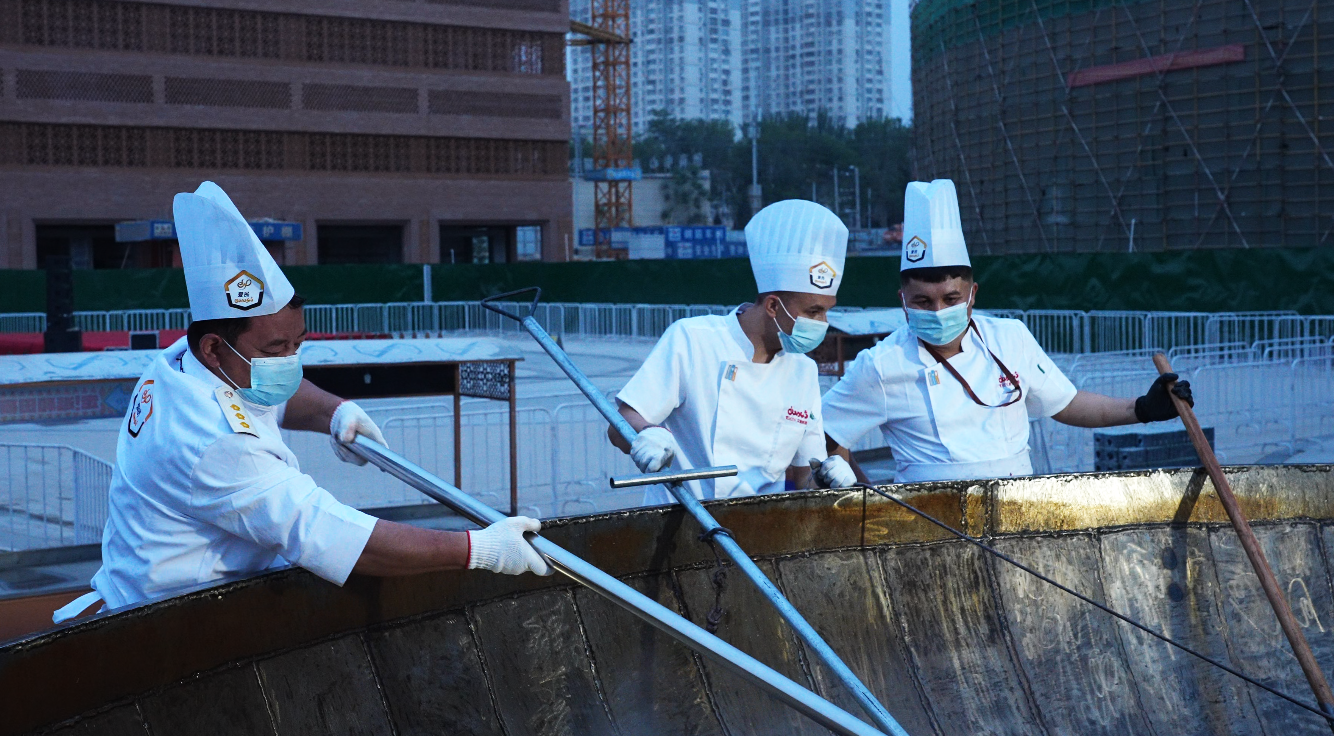 亮相的“新疆第一锅”直径达6米,深1.3米,周长18.8米,单次最大可制作2万份抓饭。当天清晨7时,20余名厨师就开始准备食材,历经7小时炖煮,抓饭出炉。