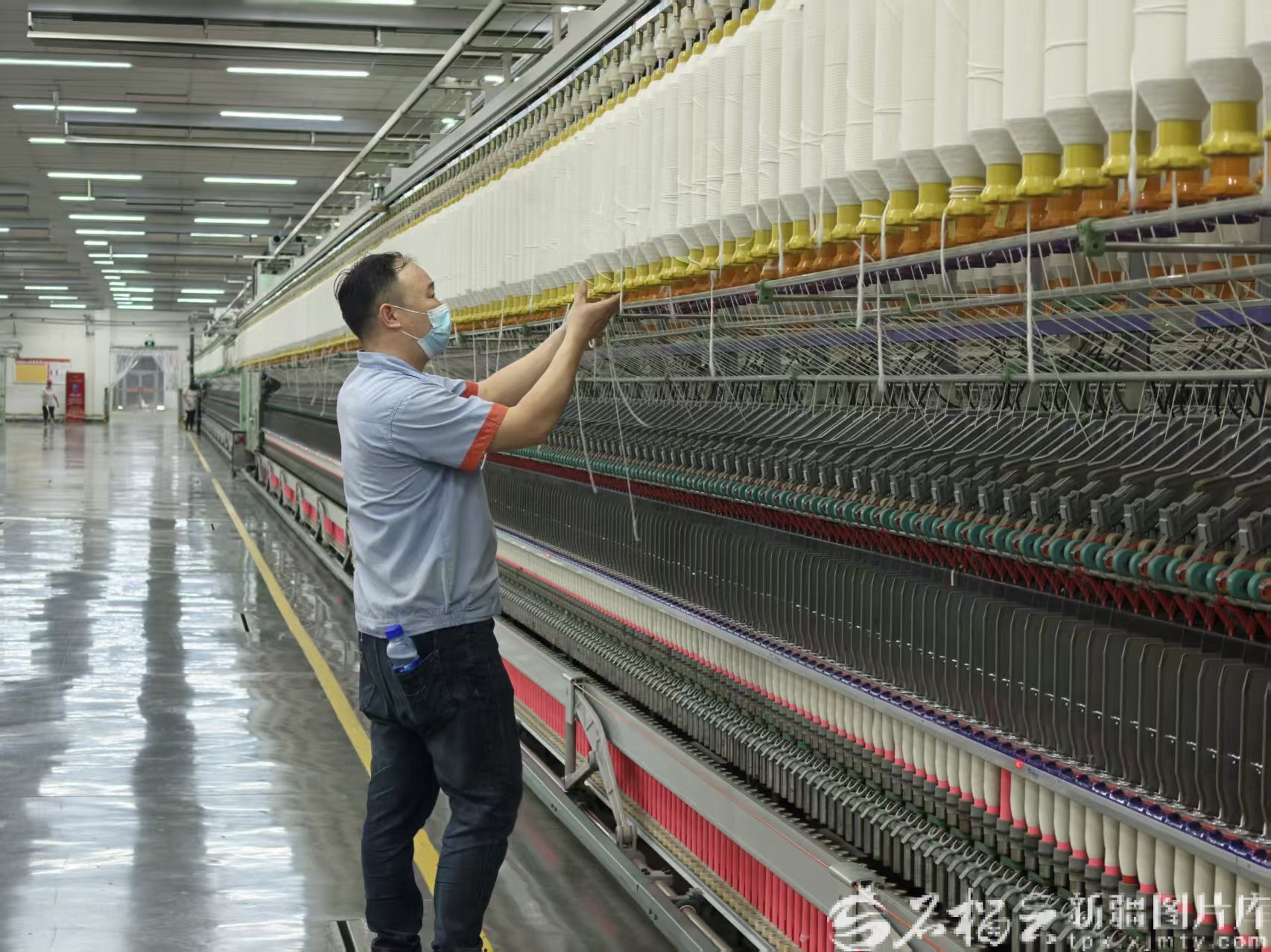 阿克苏华孚色纺有限公司生产车间里,工人在查看设备运行情况。陆雪婷 摄