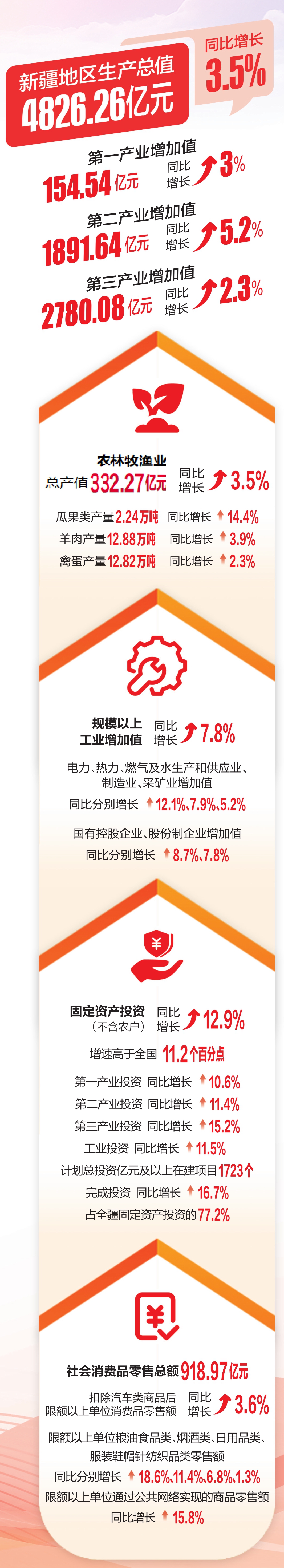 4月24日,一季度新疆经济答卷出炉,全疆地区生产总值4826.26亿元,按不变价格计算,同比增长3.5%。